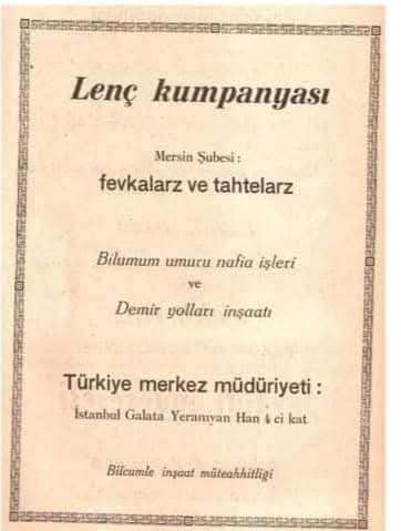 Lenz Firması; Ekli reklamlarında yer üstü ve yer altında her türlü bayındırlık iÅŸleri yaptıkları, merkezlerinin İstanbul’da, ÅŸubenin ise Mersin’de olduÄŸu yazılıdır. Kentteki ilk asfalt çalışmalarını da bu ÅŸirket yapmıştır. Dönemin Valisi Ali Rıza Ceylan, Belediye Reisi Åževket Sümer’dir.