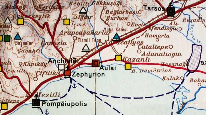 …Strabon’un “Geographika” (Coğrafya) adlı eserinde Zephyrion’dan Soli ve Mallos arasında bir kent olarak söz eder: “Lamos’tan sonra “önemli bir kent olan Soli’ye (Viranşehir/Mezitli) gelinir. … Sonra Zephyrion’a (Mersin) ve denizden biraz yukarda bulunan ve Aristobulos’a göre Sardanapallos tarafından kurulmuş olan Ankhiale’ye (Karaduvar) gelinir.”